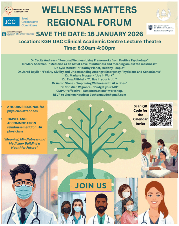 Wellness Matters Regional ForumOkanaganDate: January 16, 2026. Time: 8:30am-4:00 pm Location: KGH UBC Clinical Academic Centre Lecture Theatre RSVP to [email protected]READ MORE